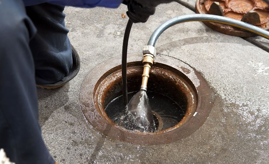 Limpeza de tubulações, fossas e caixas de gordura com jatos de alta pressão.